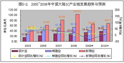 據(jù)中國半導(dǎo)體行業(yè)協(xié)會統(tǒng)計,今年1~9月份IC設(shè)計業(yè)、制造業(yè)和封裝業(yè)的銷售收入分別比2008年增長10.2%、-25.4%和-37.2%,制造業(yè)和封裝業(yè)下降幅度較大。預(yù)計2010年會隨著國內(nèi)經(jīng)濟(jì)和出口形勢的好轉(zhuǎn),將逐步回升到小幅度正增長(見圖5-1、5-2)。