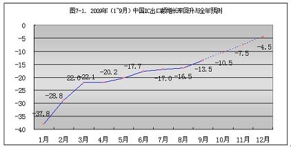 2009年1~9月份,中國大陸IC出口額的增長率從元月份的-37.8%,回升到9月份的-13.5%?;厣?4.3個百分點。按此回升速度計算,到今年年底,可回升到-4.5%(見圖7-1)。