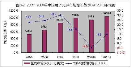 2009年,國內(nèi)電子組件市場需求規(guī)模,同2008年相比將下降4.6%,約為945.2億美元(見圖8-2)。其中,60%左右仍靠進(jìn)口。