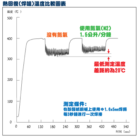 下圖表示當焊咀前端吹出氮氣和沒有使用氮氣時,焊咀溫度變化的比較。由此可以證明在使用熱氮氣的情況下,如果要把焊點提升到相同的溫度,焊咀便能夠設(shè)定較低的溫度進行焊接。
