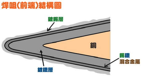進行焊接時,錫跟鐵會不斷產(chǎn)生混合反應,而由于所產(chǎn)生的混合金屬會從焊咀鍍層表面剝落,因此焊咀鍍層會逐漸被侵蝕掉,繼而錫會很快速地侵蝕焊咀內(nèi)的銅,最后會在很短時間內(nèi)造成焊咀穿洞(圖4)。