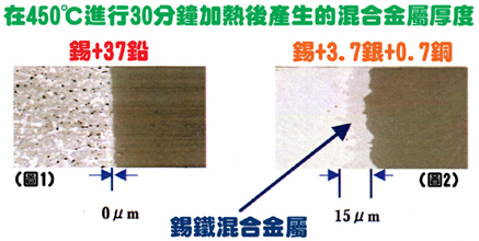 圖1表示當使用63/37傳統(tǒng)焊錫時是近乎不會產(chǎn)生混合金屬的,但當使用錫+3.7銀+0.7銅的無鉛焊錫時便會產(chǎn)生15微米厚度的混合金屬了(圖2)。