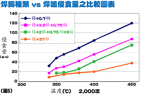 相比起傳統(tǒng)的共晶焊錫(63/37焊錫),在400℃的焊接溫度下,無鉛焊錫 錫+3.5銀+0.7銅 對焊咀的侵蝕速度要快3倍,而 錫+0.7銅更加要快4倍。