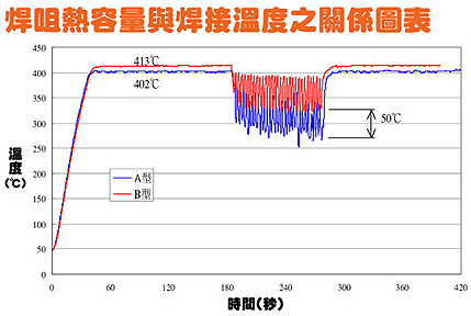 答案是B型。由于B型焊咀比A型咀焊粗(銅的部份),所以B型比A型的熱容量也較大和導熱性較快。雖然兩支焊咀形狀一樣(尖端部份),但B型咀身比較粗,焊咀越粗,銅的部份越大,保持溫度穩(wěn)定的能力也越大。(請參考以下圖表)