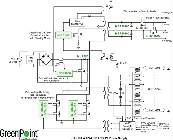 例如,目前市場上銷量最大的是32英寸液晶電視。在這類液晶電視中,采用標(biāo)準(zhǔn)24 V逆變器電源的方案在市場上仍占據(jù)多數(shù),但新興的高壓液晶電視集成電源(HV-LIPS)的應(yīng)用也在不斷增多,總體上呈現(xiàn)出并存的態(tài)勢。采用標(biāo)準(zhǔn)24 V逆變器的傳統(tǒng)液晶電視在接受110/220 Vac市電輸入后,經(jīng)過整流、PFC及濾波,轉(zhuǎn)換為200/400 Vdc的直流高壓。由于傳統(tǒng)高壓逆變器的輸入電壓要求是24 Vdc,故PFC的輸出電壓200/400 Vdc會經(jīng)過降壓轉(zhuǎn)換,產(chǎn)生多路輸出電壓,其中一路24 Vdc電壓提供給高壓逆變器,再經(jīng)過DC-AC轉(zhuǎn)換為超過1,000 V甚至達(dá)2,000 V的交流高壓,去驅(qū)動液晶面板的CCFL陣列。安森美半導(dǎo)體為這類傳統(tǒng)液晶電視推出了220 W液晶電視電源GreenPoint參考設(shè)計,其中采用的關(guān)鍵元器件包括NCP1606 CrM PFC控制器、NCP1396諧振半橋控制器及NCP1027待機(jī)控制器等。