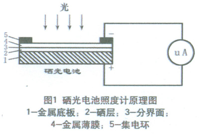 測量照度的儀器是照度計,或稱勒克斯計。照度計通常是由硒光電池或硅光電池和微安表組成,見圖1。硒光電池是把光能直接轉(zhuǎn)換成電能的光電元件。當(dāng)光線射到硒光電池表面時,入射光透過金屬薄膜4到達半導(dǎo)體硒層2和金屬薄膜4的分界面上,在界面上產(chǎn)生光電效應(yīng)。產(chǎn)生電位差的大小與光電池受光表面上的照度有一定的比例關(guān)系。這時如果接上外電路,就會有電流通過,電流值從以勒克斯(Lx)為刻度的微安表上指示出來。光電流的大小取決于入射光的強弱和回路中的電阻。照度計有變檔裝置,因此可以測高照度,也可以測低照度。