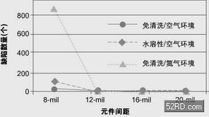 圖1顯示出三種不同組裝工藝的良品率情況。由圖可見,使用免清洗焊膏在空氣環(huán)境下進行回流焊產(chǎn)生的不良最少,總數(shù)為66個;使用水溶性焊膏在空氣環(huán)境下進行回流焊次之,不良有1,499個;使用免清洗型焊膏在充氮環(huán)境下進行回流焊產(chǎn)生的不良數(shù)最多,為5,665個。圖3還表明在充氮環(huán)境下以及焊膏助焊成分活性增大(水溶性焊膏)時,產(chǎn)生的不良數(shù)目會增多。