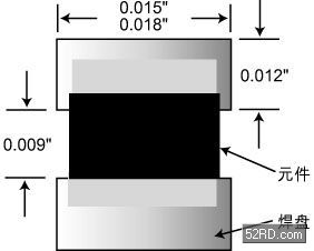 圖4給出批量進行0201元件回流焊時的元件焊盤設(shè)計建議。建議兩焊盤間距0.009英寸,焊盤長度0.012英寸,寬度在0.015英寸到0.018英寸之間,具體取決于助焊劑成分類型和焊膏回流焊環(huán)境。0.018英寸寬度適用于充氮焊接環(huán)境、氧氣含量很低(50ppm以下)以及焊劑活性很強或潤濕時間很短的情況;而0.015英寸寬度焊盤則適用于在空氣環(huán)境中進行回流焊接、焊膏溶劑活性較弱以及有較長的潤濕時間等情況。