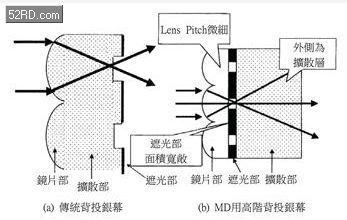 事實(shí)上早期的MD方式RP-TV都是使用CRT背投電視螢?zāi)?,因此始終無(wú)法充分發(fā)揮MD方式RP-TV的特性,有監(jiān)于此日本凸版印刷公司首度開發(fā)如(圖五)所示MD方式RP-TV專用螢?zāi)唬蓤D可知MD方式RP-TV專用螢?zāi)坏腖enticularLens與遮光部各自獨(dú)立設(shè)置,尤其是遮光部設(shè)于擴(kuò)散部后面革命性設(shè)計(jì),使得該MD方式RP-TV專用螢?zāi)豢梢跃邆錁O佳的光學(xué)特性。