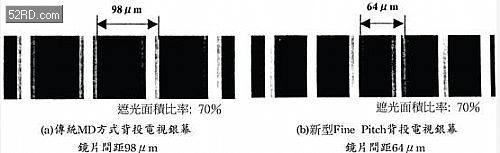 如上所述RP-TV用螢?zāi)煌ǔJ窃诿髁潦覂?nèi)環(huán)境中使用,對(duì)RP-TV螢?zāi)欢宰钄嗍覂?nèi)外亂光提高影像對(duì)比(Contrast)非常重要。影像光線穿透時(shí)不會(huì)被遮光部遮蔽的前提下,通常開口部的面積越小,亦即遮光部的面積比率越大,遮蔽外亂光的能力越強(qiáng),影像對(duì)比也越高。