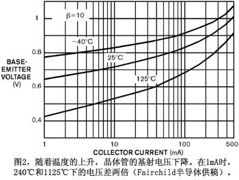 熱與冷都會對電路造成負面影響。在極高溫下,芯片可能燒毀(圖1)。更常見的情況是,如果你的設(shè)計達到未曾預(yù)料的溫度,很多部件都可能超出規(guī)定極限。當出現(xiàn)這種情況時,電路就可能表現(xiàn)出難以預(yù)料的行為。另外一個情況也同樣值得關(guān)注,即電路溫度從熱到冷,然后又從冷到熱。這種狀況會造成熱沖擊,也會毀壞元件。很多工程師并不關(guān)心自己的電路在低溫下的性能,但這種忽視是一個錯誤。半導(dǎo)體器件的性能在低溫下會發(fā)生顯著變化。雙極晶體管的基射結(jié)電壓在低溫下會大大升高(圖2和參考文獻1)。AnalogDevices產(chǎn)品開發(fā)工程經(jīng)理FranciscoSantos說:“如果你要設(shè)計一個能夠在負溫度下工作于1.8V的放大器,就要考慮當從室溫降到-40℃時,VBE(基射電壓)會增加130mV。這種情況將迫使設(shè)計者采用一組完全不同的放大器架構(gòu)。”