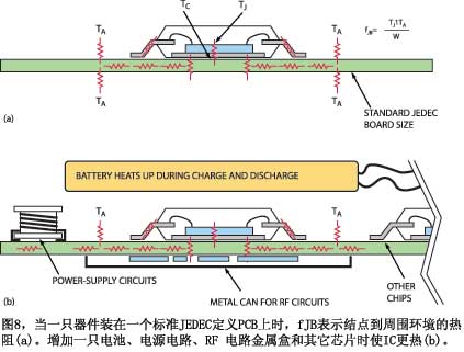 對流散熱也有一些困難。例如,氣流對商用散熱片的影響(圖7)。注意,在高溫下,熱阻會增加五倍。使用強制風冷的散熱片有較薄、間距更近的鰭片,比如一款風扇式CPU冷卻器。如果你的產(chǎn)品沒有風扇,則IC產(chǎn)生的熱量會傳導(dǎo)和散播出來,然后傳送到機內(nèi)的空氣中。接下來,隨著整個機器溫度的上升,熱量通過對流傳送給周圍的空氣,如果你把機器放在腿上,則部分熱量也會傳導(dǎo)過來。外殼材料的熱阻就變得很重要。熱量從內(nèi)向外的傳送速度,塑料殼要慢于金屬殼。