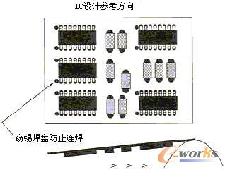 PCB上元器件的布局對生產效率和成本有相當重要的影響,是衡量PCB設計的可裝聯(lián)性的重要指標。一般來講,元器件盡可能均勻地、有規(guī)則地、整齊排列,并按相同方向、極性分布排列。有規(guī)則的排列方便檢查,有利于提高貼片/插件速度,均勻分布利于散熱和焊接工藝的優(yōu)化。另一方面,為簡化工藝流程,PCB設計者始終都要清楚,在PCB的任一面,只能采用回流焊接和波峰焊接中的一種群焊工藝。這點在組裝密度較大、PCB的焊接面必須分布較多貼片元器件時,尤其值得注意。設計者要考慮對焊接面上的貼裝元件使用何種群焊工藝,最為優(yōu)選的是使用貼片固化后的波峰焊工藝,可以同時對元件面上的穿孔器件的引腳進行焊接;但波峰焊接貼片元件有相對嚴格的約束,只能焊接0603及以上尺寸的片式阻容﹑SOT﹑SOIC(引腳間距≥1mm且高度小于2.0mm)。分布在焊接面的元器件,引腳的方向宜垂直于波峰焊接時PCB的傳送方向,以保證元器件兩邊的焊端或引線同時被浸焊,相鄰元件間的排列次序和間距也應滿足波峰焊接的要求以避免“遮蔽效應”,如圖1。當采用波峰焊接SOIC等多腳元件時,應于錫流方向最后兩個(每邊各1)焊腳處設置竊錫焊盤,防止連焊。