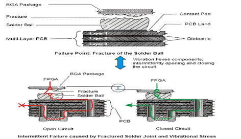 隨著時(shí)間的推移,焊接部位會(huì)因?yàn)槔鄯e應(yīng)力的損傷而產(chǎn)生裂縫。裂縫常見于器件與PCB焊接的邊緣。裂縫會(huì)造成焊接球與BGA封裝器件或PCB板的部分分開。一種典型的裂縫位置在BGA封裝和焊接球之間,另一種典型的裂縫在PCB和焊接球之間.對(duì)已有裂縫的焊接球的繼續(xù)損傷就會(huì)導(dǎo)致另一種類型的失效-焊接球斷裂。