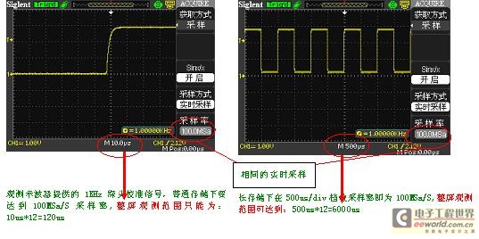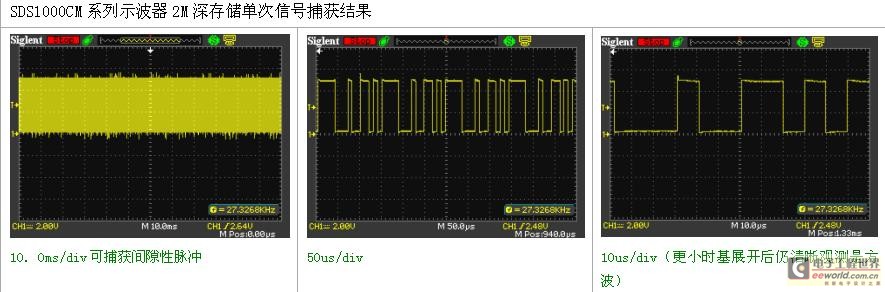 提高示波器的存儲深度可以間接提高示波器的采樣率。以一臺采樣率為1Gsa/s、存儲深度為20K的示波器為例來說,只要水平掃描速度在20ns/div以上時基,采樣速度就會急速下降。因為當(dāng)需要測量較長時間的信號波形時,必然要求大的時基檔位,這就造成采樣率的下降,采樣率的下降可能會遺漏信號的細節(jié)勢必造成信號波形質(zhì)量的下降。這時候就需要大的存儲深度來維持更高的采樣率來采樣測量。長存儲在保證獲取不失真的波形的同時又可以觀察更長時間的信號。