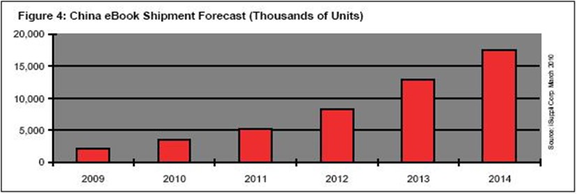 據(jù)iSuppli公司,2010年中國(guó)市場(chǎng)的電子書(shū)出貨量將達(dá)到360萬(wàn)個(gè),比2009年的210萬(wàn)大增70.7%。到2014年,中國(guó)市場(chǎng)的電子書(shū)出貨量將達(dá)到1760萬(wàn)個(gè)。