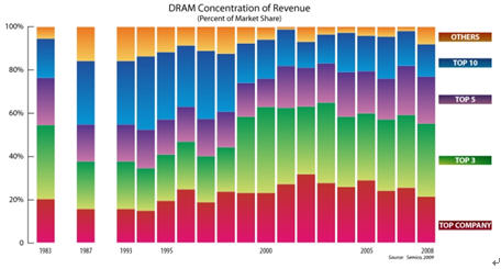 能夠看到的兼并主要集中在半導體的制造部分, 如在存儲器DRAM, 尤其是近10年來。從數(shù)據(jù)看DRAM供應商中, 前1, 前3及前5及前10位從進入新世紀以來它們的份額都在減少, 實際上近25年來它們己進行了多次兼并。從1983年計(公司剛開始有DRAM數(shù)據(jù))DRAM的前1, 前3及前5的市場份額幾乎未變, 而依前10計, 比1983年時還稍少了一些。
