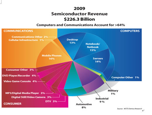 那么未來將會是怎么樣呢?只要晶體管的數(shù)量按目前的高增長倍率繼續(xù)走下去,各種新的應用會層出不窮,推動半導體市場總量進一步提高。因此全球半導體市場在近15年來看似十分穩(wěn)定,雖然如臺式計算機市場已經(jīng)飽和,但是筆記本電腦和上網(wǎng)本開始流行,加上消費類電子產(chǎn)品如游戲機,平板電視,MP3, 數(shù)碼相機等, 由于半導體含量的增加推動了半導體TAM的增加。