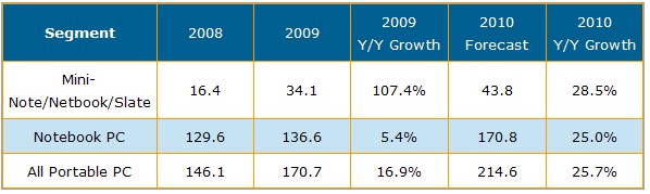 隨著平板電腦市場加溫,DisplaySearch以為2010年上網(wǎng)本及平板電腦將是最快速成長的應用別。同時由于開發(fā)中國家需求增加與下半年商用市場復蘇,傳統(tǒng)翻蓋式筆記本電腦也將持續(xù)增長。對于2010年全球筆記本電腦市場總量估計可達2億1千5百萬臺,年增長率為25.7%。
