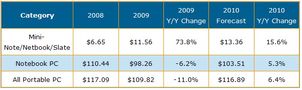 展望2010年筆記本電腦市場,出貨量將有強勁增長同時銷售價格降幅趨于緩和,使得便攜式電腦市場的營業(yè)額能達到1千170億美金,恢復到2008年的水平。上網(wǎng)本與平板電腦將是營收增長最高應用別,主要是由于高單價產(chǎn)品的推出;不過上網(wǎng)本平均銷售價格將由2009年每臺400美元下滑到每臺300美元;而Apple iPad將是該應用別主要出貨貢獻,平均單價從入門機種每臺499美金到高階機種超過每臺800美金之上都有。