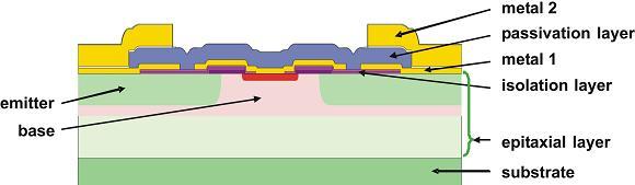 通過(guò)選擇不同的低電阻襯底,比如:圖1所示的摻磷/摻砷襯底,可以有效降低半導(dǎo)體中的電壓降比例。另一個(gè)重要的影響因素是電流分配,應(yīng)在整個(gè)芯片范圍內(nèi)盡可能保持均衡,將芯片前端金屬化擴(kuò)展電阻降至最低。對(duì)于BISS晶體管,芯片中的均衡電流分配通過(guò)一種稱為網(wǎng)格技術(shù)的手段來(lái)實(shí)現(xiàn)——將晶體管分成不同的格柵結(jié)構(gòu)。第四代BISS晶體管采用受專利保護(hù)的雙層金屬化布局,能夠最大程度提升發(fā)射極線路金屬厚度,降低飽和電阻(參見(jiàn)圖2)。