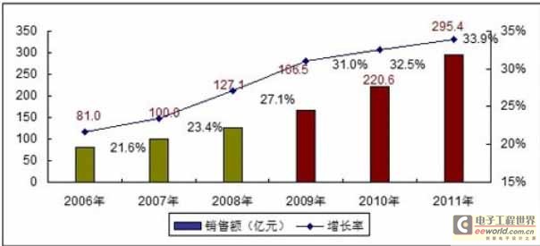 圖1 2006-2011年中國便攜醫(yī)療電子市場規(guī)模與預(yù)測