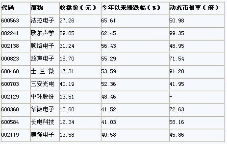 二級市場的表現(xiàn)一向來都是先于上市公司的經(jīng)營情況的。今年以來許多電子類公司就出現(xiàn)了不同程度的上漲,該行業(yè)的今年以來算術(shù)平均漲幅達20.6%。其中今年以來漲幅最大的是法拉電子,上漲達65.61%。其次是歌爾聲學,上漲幅度達62.45%。特別注意的是隨著一季度業(yè)績的公布,這些大幅上漲的個股,由于凈利潤的同時上漲,PE也并未明顯增高。