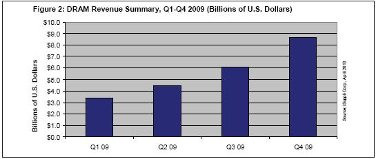 2009年第一季度創(chuàng)下2001年以來的最低營業(yè)收入,DRAM產業(yè)隨后持續(xù)穩(wěn)步改善,第四季度營業(yè)收入達到87億美元,比第三季度的61億美元勁增43%。這樣的結果足以使2009年第四季度成為過去10年來DRAM市場表現(xiàn)最好的五個季度之一。