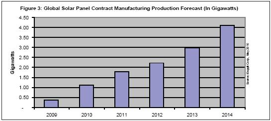 2010年合同制造商將生產(chǎn)1.1GW的太陽能電池板,比2009年時的369MW大增200%。其余的生產(chǎn)任務(wù)將由專門的太陽能電池板廠商以及其它企業(yè)承擔(dān)。2014年合同制造商生產(chǎn)的太陽能電池板將比2010年增長近三倍,達到4.1GW。