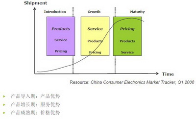 對原廠來說,市場開發(fā)策略會隨著產(chǎn)品的不同生命周期而發(fā)生變化。在產(chǎn)品導(dǎo)入期,產(chǎn)品的優(yōu)勢最為突出,此時穩(wěn)定產(chǎn)品性能和表現(xiàn)最重要,在產(chǎn)品增長期,競爭漸多,客戶的要求也開始提高,產(chǎn)品本身的優(yōu)勢可能最多3月甚至1個月就被競爭對手追趕或超過。在產(chǎn)品增長期末端和產(chǎn)品成熟期,市場差異化的空間已經(jīng)不大,上下游趨于集中,此時原廠經(jīng)過激烈競爭后已經(jīng)只剩幾家寡頭,市場進(jìn)入拼價格的階段,這個時候,價格決定一切,原廠開始突出價格優(yōu)勢。