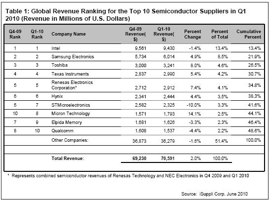 新成立的半導(dǎo)體供應(yīng)商瑞薩電子強(qiáng)勢(shì)出場(chǎng),第一季度在10大半導(dǎo)體排行榜中名第第五。