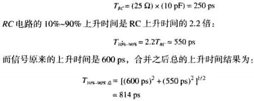 如第三個波形所示,當(dāng)連接的串聯(lián)電感很小時,探頭等效于一個簡單的電容負(fù)載。圖3.12所示的測試點等效信號源端阻抗為25歐,當(dāng)耦合到10PF的容性負(fù)載時,其RC上升時間是: