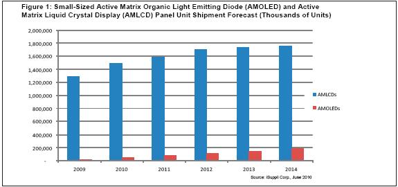 圖1所示為iSuppli公司對2009-2014年小尺寸AMLCD和AMOLED的出貨量預測。iSuppli公司對小尺寸顯示器的定義是:對角尺寸小于等于9英寸的顯示器。