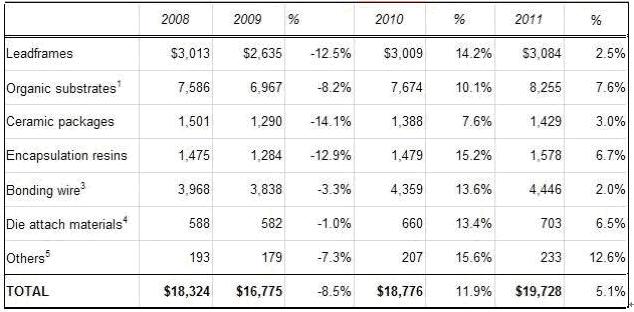 預(yù)測2011年封裝材料將下降到個位數(shù)的增長, 雖然其它others類包括如硅片級封裝WLP的介質(zhì)材料及焊球, 它們的增長率都在低的兩位數(shù)。注意到鍵合線在2011年減緩, 看到幾乎很少有的2%增長, 但還是比引線框架leadframes多(盡管leadframes出貨量己經(jīng)超過下降周期之前水平)