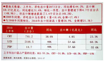 - 2010年上半年,彩電出口總量為2873萬臺(tái),同比增長(zhǎng)44.2%