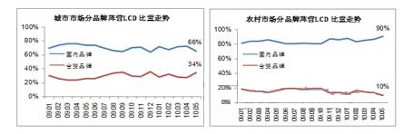 圖2 城市與農(nóng)村市場(chǎng)中外品牌比重走勢(shì)