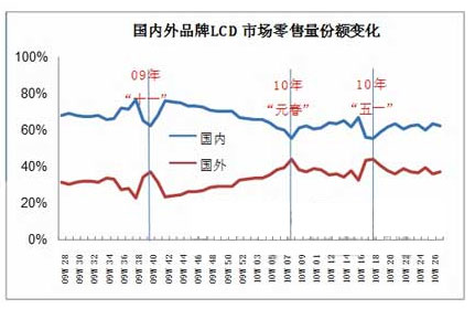 尤其在節(jié)慶期間,外資品牌大規(guī)模的降價(jià)促銷,使得國內(nèi)電視品牌城市市場(chǎng)的規(guī)模及利潤大幅縮減。2010年五一前,外資品牌重點(diǎn)在32英寸的2499/2999元兩個(gè)定價(jià)點(diǎn),逐步擴(kuò)張城市中低端市場(chǎng)。從五一開始,外資品牌將策略延伸至大尺寸,40英寸平板電視價(jià)格低至4499元,將內(nèi)外資品牌電視價(jià)差降至500元以內(nèi),對(duì)國產(chǎn)品牌產(chǎn)生較大沖擊。不過,在農(nóng)村市場(chǎng),國內(nèi)電視企業(yè)面對(duì)家電下鄉(xiāng)政策帶來的巨大機(jī)會(huì),可憑借一貫的本土優(yōu)勢(shì)全力彌補(bǔ)城市市場(chǎng)的份額損失,從而使其與外資電視品牌市場(chǎng)份額比例保持在7:3(見圖3)。