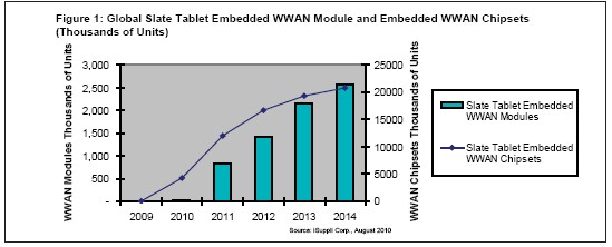 圖1所示為iSuppli公司對于2009-2014年slate平板電腦市場嵌入WWAN模塊與嵌入WWAN芯片組出貨量的預(yù)測。