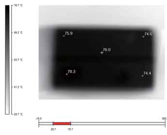 圖6~9是利用Ti20拍攝的金升陽(yáng)公司12W產(chǎn)品的熱圖像。通過這些圖片,我們不僅可以清晰地看出整體的熱分布(相同的溫度,所用的顏色是一致的),還可以借助其提供的軟件分析每一個(gè)元器件此時(shí)對(duì)應(yīng)的溫度值,如幾個(gè)溫度相對(duì)較高的元器件的溫度值分別如表1所示。