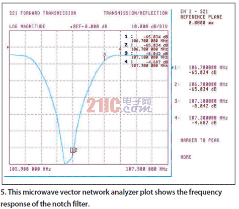 圖5:微波矢量網(wǎng)絡(luò)分析儀測量到的陷波濾波器的頻率響應(yīng)。