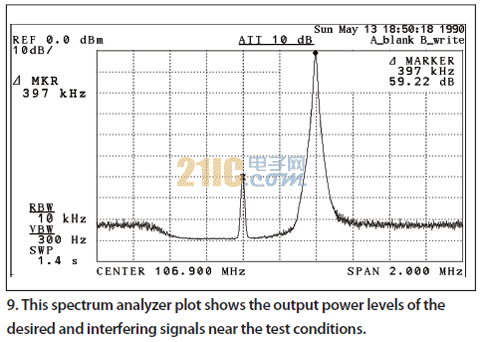 圖8和圖9所示的頻譜分析儀波形證明了功率電平是精確的,并且不存在由于整合兩個信號發(fā)生器而引入的IM3。額外的測試表明陷波濾波器確實(shí)能有效地抑制來自發(fā)生器的噪聲,而隨后在感興趣頻率點(diǎn)的測量受限于熱噪聲,而不是來自測試系統(tǒng)的噪聲。音頻測量是利用URT音頻分析儀在干擾信號中心頻率的不同偏移處于測試接收機(jī)的輸出端進(jìn)行的。這樣,接收機(jī)去敏感效應(yīng)將證明裝置的本底噪聲并不影響測試案例的測量。