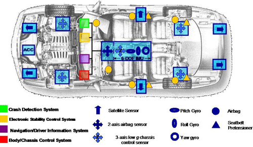 在汽車的主動與被動安全保護領域,市場趨勢主要包括以下幾個方面:首先,傳感器趨于整合,例如將ESP與安全氣囊放置在同一ECU之內;其次,傳感器的界面將趨于標準化,其中包括數(shù)字界面,SPI、DSI以及PSI5。目前,市場上PSI5的采用率要高于DSI;第三,市場上對高性能陀螺儀的需求將逐漸增多,尤其是配有高級駕駛輔助系統(tǒng)如ACC的汽車;第四,中國和印度等國家已經(jīng)在司法層面上做出規(guī)定,要求所有汽車100%裝有安全氣囊; 第五、歐洲國家也頒布了有關行人保護的法規(guī),車載衛(wèi)星導航將成為主要趨勢,因此正面撞擊傳感器將成為主要的解決方案。