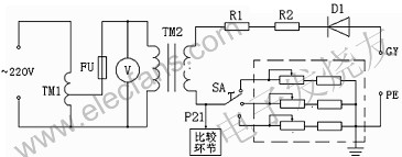 圖中TM1為調(diào)壓器,TM2為高壓變壓器,TM2產(chǎn)生的高壓經(jīng)高壓二極管D1整流得到0~3萬伏(峰值電壓)的直流高壓。高壓電阻R1、R2為限流電阻,我們以電壓表V來間接指示實(shí)際的高壓值,也就是以高壓變壓器TM1初級的低壓送入電壓表,其表頭上指示的電壓數(shù)值是根據(jù)高壓變壓器初、次關(guān)系換算后的高壓值。這樣處理既可節(jié)約成本又可保證安全。本設(shè)備將P21點(diǎn)電壓送至另一比較環(huán)節(jié),此電壓與設(shè)定的泄漏電流比較來控制是否聲光報(bào)警,以此剔除不合格品。由于電池殼的材質(zhì)略有不同,空氣濕度也有變化,各種因素都可能引起合格電池殼情況下P21點(diǎn)的電壓發(fā)生微小變化,這種變化已足以導(dǎo)致設(shè)備誤判斷。為了解決這種問題,我們在主回路中串入了不同的電阻(虛線框中),以調(diào)節(jié)旋鈕SA來作出選擇,用以抵消各種影響,可避免設(shè)備的誤判斷。