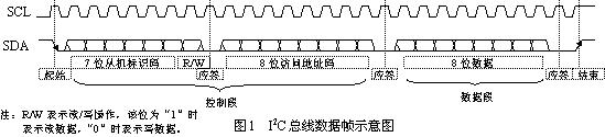 如圖1所示是常見的I2C總線上傳輸?shù)囊蛔止?jié)數(shù)據(jù)的數(shù)據(jù)幀,其總線形式是由數(shù)據(jù)線SDA和時(shí)鐘SCL構(gòu)成的雙線制串行總線,并接在總線上的電路模塊即可作為發(fā)送器(主機(jī))又可作為接收器(從機(jī))。幀數(shù)據(jù)中除了控制碼(包括從機(jī)標(biāo)識碼和訪問地址碼)與數(shù)據(jù)碼外還包括起始信號、結(jié)束信號和應(yīng)答信號[4]。