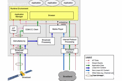 線性的音視頻內(nèi)容的處理與廣播電視終端(或只支持衛(wèi)星、地面或有線數(shù)字電視的終端)完全一樣,所有與DVB相關(guān)的功能也都完全支持(如頻道列表、EIT信息處理、選擇業(yè)務(wù)與調(diào)頻等),由廣播處理器(BroadcastProcessing)組件處理,音視頻等媒體內(nèi)容的播放由媒體播放器(MediaPlayer)組件負(fù)責(zé)。