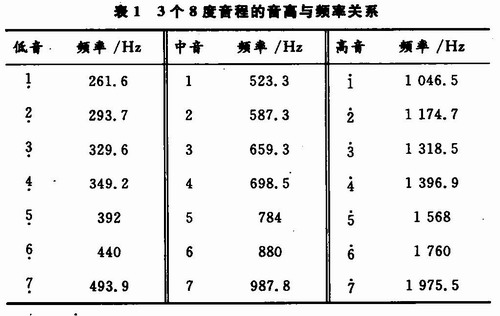 分析表1可見,表中3個(gè)不同音程相同音名(同一行)的信號頻率都相差一倍。