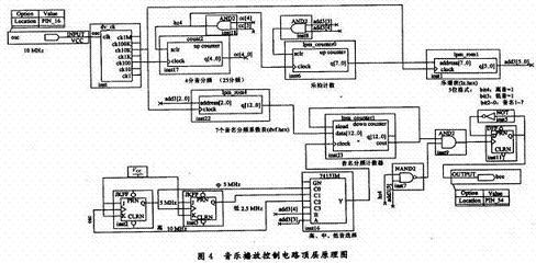根據(jù)設(shè)計(jì)電路原理框圖,曲譜碼以分頻數(shù)編碼,音高信號分頻由一個(gè)可預(yù)置的模N計(jì)數(shù)器實(shí)現(xiàn)。分頻系數(shù)表和曲譜表都存儲在ROM中。若希望控制蜂鳴器的信號占空比為50%,分頻器的輸出信號采用二分頻電路實(shí)現(xiàn)占空比整形,但注意信號頻率被降低一半。電路原理框圖中M分頻器的作用是產(chǎn)生合適的時(shí)值計(jì)數(shù)脈沖頻率。電路的頂層原理圖如圖4所示。