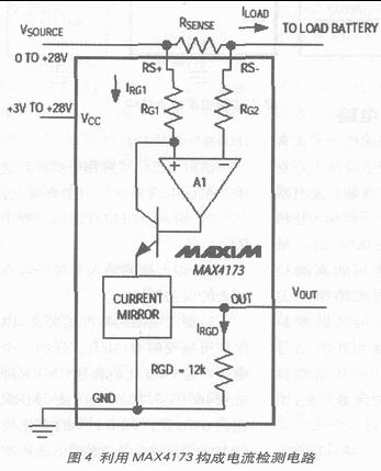 MAXIM推出了一系列雙向或單向電流檢測(cè)IC,有些雙向電流檢測(cè)IC內(nèi)置檢流電阻,可檢測(cè)流入或流出被檢電路的電流大小并通過(guò)一個(gè)極性指示引腳顯示電流方向。增益可調(diào)的電流檢測(cè)IC、固定增益(+20V/V,+50V/V,或+100V/V)電流檢測(cè)芯片或包括單雙比較器的固定增益電流檢測(cè)IC,都采用小體積封裝,如SOT23,可滿(mǎn)足對(duì)尺寸要求苛刻的應(yīng)用。圖4是用MAX4173構(gòu)成的高端電流檢測(cè)電路。[page]