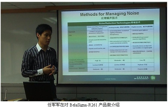 生活在都市的人們通常會(huì)在嘈雜的環(huán)境中撥打或接聽(tīng)電話,人們總是希望能夠像在田野中一般獲得清晰并且沒(méi)有失真的聲音。對(duì)于手機(jī)廠商來(lái)講,采用能夠清晰拾取語(yǔ)音并抑制噪聲的解決方案是關(guān)鍵。為了應(yīng)對(duì)上述挑戰(zhàn),安森美半導(dǎo)體推出了高性能語(yǔ)音捕獲SoC方案BelaSigna-R261。安森美半導(dǎo)體音頻與助聽(tīng)器中國(guó)市場(chǎng)開(kāi)發(fā)經(jīng)理任軍軍在日前的產(chǎn)品發(fā)布會(huì)上對(duì)BelaSigna-R261的特性做了介紹,并現(xiàn)場(chǎng)對(duì)產(chǎn)品進(jìn)行了演示。
