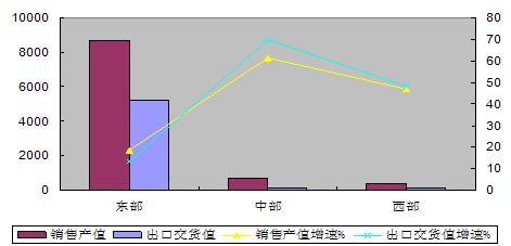 西部地區(qū)銷售產(chǎn)值和出口交貨值分別增長46.9%和48%,出口高出行業(yè)平均水平25.3和33.2個百分點(diǎn)。四川、重慶正逐步成為行業(yè)新的增長極,銷售產(chǎn)值分別增長45%和162.5%。